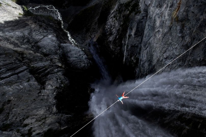 Профессиональный канатоходец Лукас Ирмлер прошёл по канату, натянутому над высочайшим водопадом мира Хунлен (Канада). Его путь проходил на высоте 401 м. Посередине своего экстремального маршрута Лукас лёг спиной на канат, расставив в стороны руки и ноги. Такой трюк очень сложен в исполнении, оттого его фото облетели прессу во всём мире.