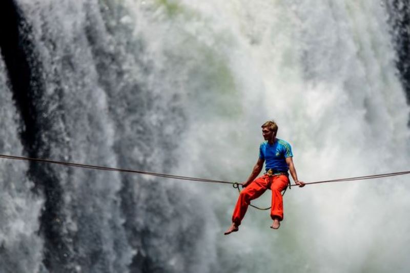 Профессиональный канатоходец Лукас Ирмлер прошёл по канату, натянутому над высочайшим водопадом мира Хунлен (Канада). Его путь проходил на высоте 401 м. Посередине своего экстремального маршрута Лукас лёг спиной на канат, расставив в стороны руки и ноги. Такой трюк очень сложен в исполнении, оттого его фото облетели прессу во всём мире.