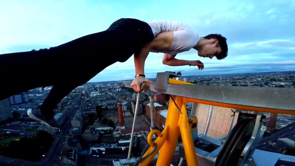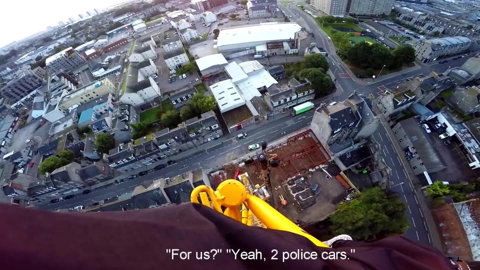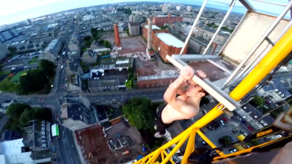 Двое экстремалов из шотландского города Абердин устроили сумасшедший воркаут на краю высоченного башенного крана. 19-летний Элвис Богданов вместе с другом 23-летним Томом Залитисом взобрались на конструкцию и на огромной высоте без страховки начали выполнять силовые упражнения и подтягиваться, повиснув на элементах башенного крана.