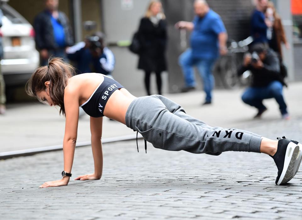 Красотка эффектно избавилась от костюма панды, а затем показала свое идеальное спортивное тело в одежде из новой коллекции всемирно известного бренда. Прохожие смогли оценить ее стальной пресс.