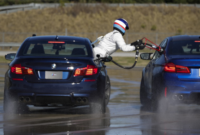 Чтобы установить рекорд, в BMW придумали систему дозаправки автомобиля на ходу. Работало это так: параллельно с M5 Шварца начинала дрифтовать еще одна машина с дополнительным баком в багажнике. Каскадер, высунувшись из окна второго автомобиля, подсоединял шланг к машине Шварца и запускал перекачку бензина.