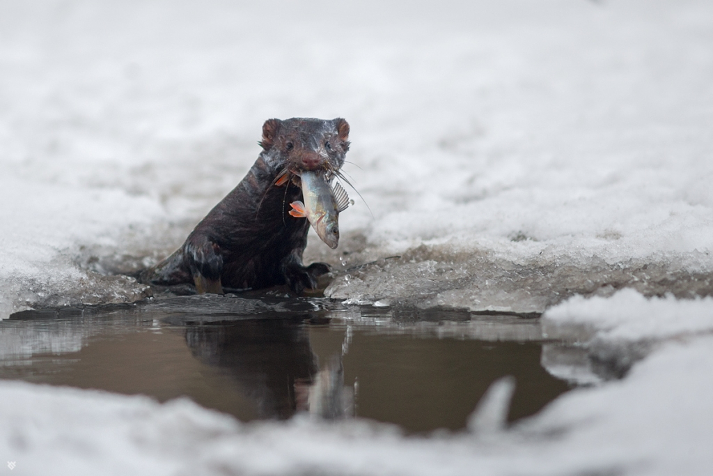 Зверек схватил добычу и быстро убежал. Рыбак успел снять все это на видео и выложить в Сеть.