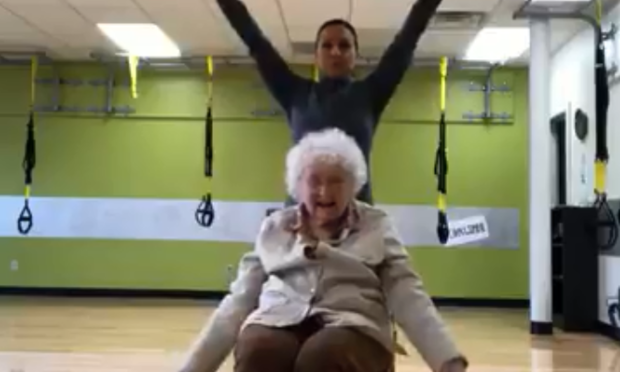 Девушка сняла , как ее мама тренирует 93-летнюю старушку. Пожилая женщина веселиться и смеется с удовольствием повторяя все движения и буквально молодеет на глазах.