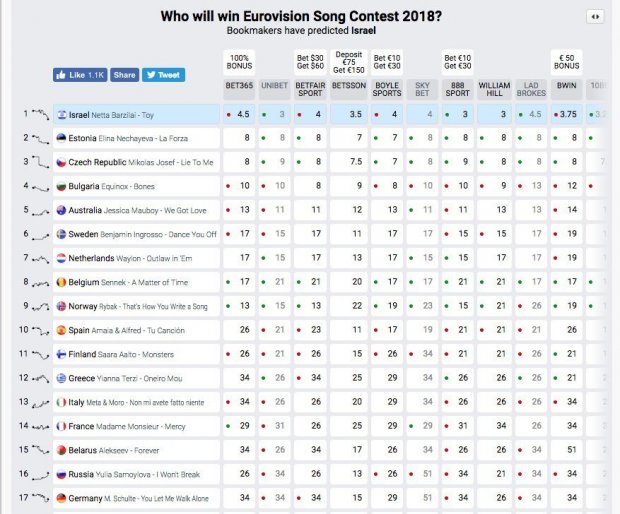 На третьем месте —чешский исполнитель Миколас Йозеф. Украина не вошла в Топ-15 претендентов на победу.