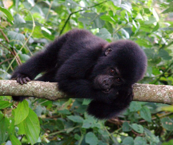 Маленькая горилла не удержалась на ветке и на глазах у туристов упала вниз. Это произошло в Национальном парке Бвинди в Уганде.
