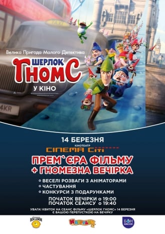 Кинопрокатная компания B&H представляет с 15 марта новый анимационный фильм Шерлок Гномс. Премьера, кстати, состоится 14 марта в кинотеатре Cinema Citi. Начало вечеринки в 19:00