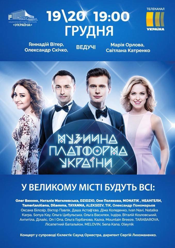 19-20 декабря 2017 года в Национальном дворце искусств «Украина» состоятся съемки финальной программы концертного цикла «Музыкальная платформа Украины 2017».
