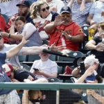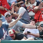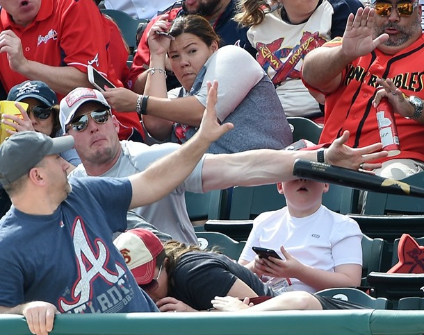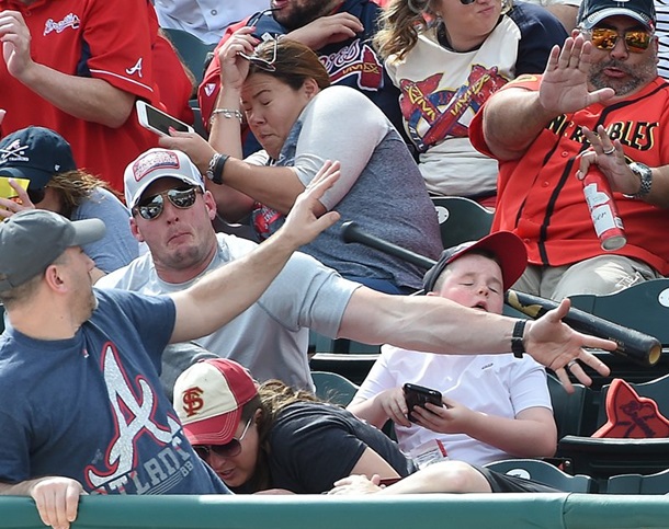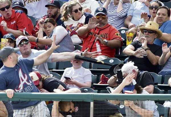 Бита вырвалась из рук игрока команды Питтсбург Пайрэтс и полетела в сторону зрителей. 37-летний отец успел отреагировать и защитить рукой лицо своего ребенка.
