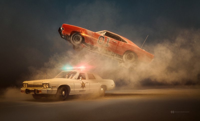 Мексиканский фотограф Феликс Эрнандес представил серию фотографий, на которых воспроизвел сцену из популярного американского сериала 1970—1980-х годов The Dukes of Hazzard («Придурки из Хаззарда»). При этом он использовал игрушечные модели автомобилей, пишет PetaPixel.