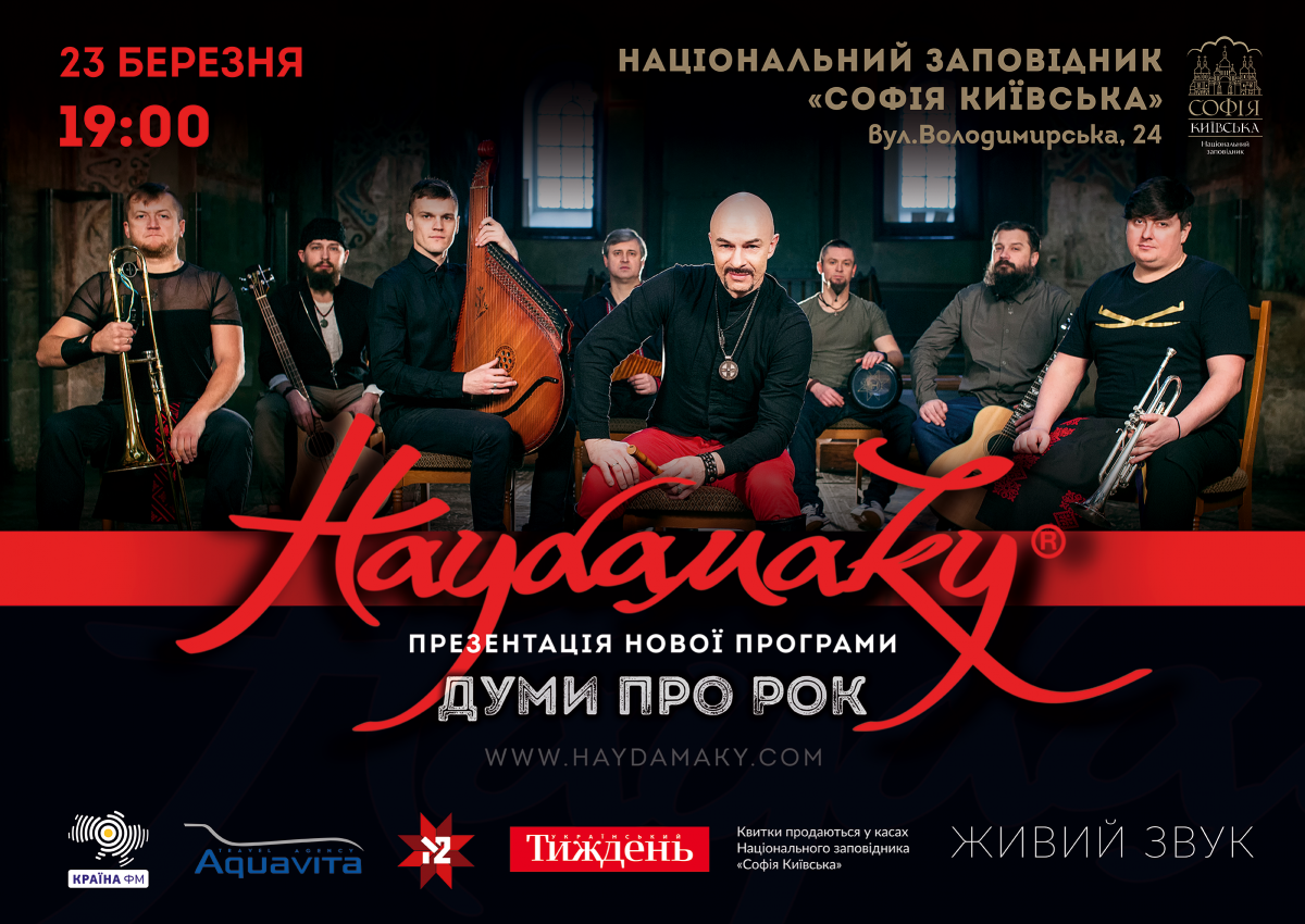 23 марта украинская рок-группа «Гайдамаки» представляет новую акустическую программу «Думи про Рок». Присутствующих ожидает погружение в современную культуру обновленной казацкой традиции: казак — это современный украинец-воин, мудрый и отважный, уверен в себе и успешным.