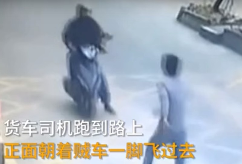 Вирусную популярность в сети приобретает запись с уличных камер наблюдения китайского города Фошань. Видео показывает, как неизвестный грабитель залазит в кузов грузовика и вытаскивает мобильный телефон. Затем мужчина пытается скрыться на скутере. Однако владеющий боевым мастерством водитель останавливает его эффектным ударом, пишет Новое время.
