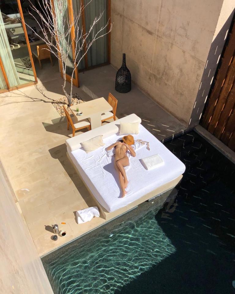 На одном снимке она лежит голой у бассейна, прикрыв грудь руками. Девушка позирует на лежаке, а сама фотография сделана с высоты.