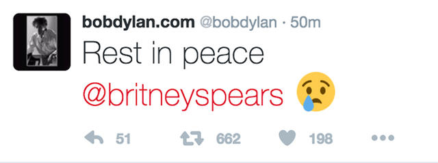 Хакеры из объединения OurMine взломали профили компании Sony Music Global и музыканта Боба Дилана, чтобы разместить на них сообщения о смерти певицы Бритни Спирс. Несмотря на то, что это фейк, эти сообщения активно разлетелись по социальным сетям, собрав тысячи репостов.
