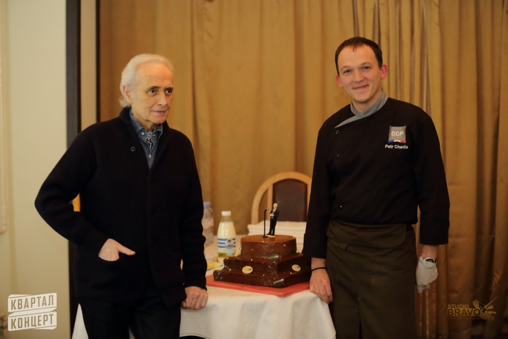 В этот вечер друга Лучано Паваротти ждал еще один сюрприз: в качестве подарка на 70-летний юбилей, который он отпраздновал 5 декабря, кондитер Public cafe Петр Чедия преподнес прославленному музыканту огромный торт с его шоколадной копией. Перед этой встречей кондитер так переволновался, что не спал четверо суток. «В каждый свой торт я вкладываю душу», – признался Петр Чедия. По словам кондитера, вэтот кулинарный шедевр было вложено столько сил и ресурсов, что оценить его стоимость невозможно.