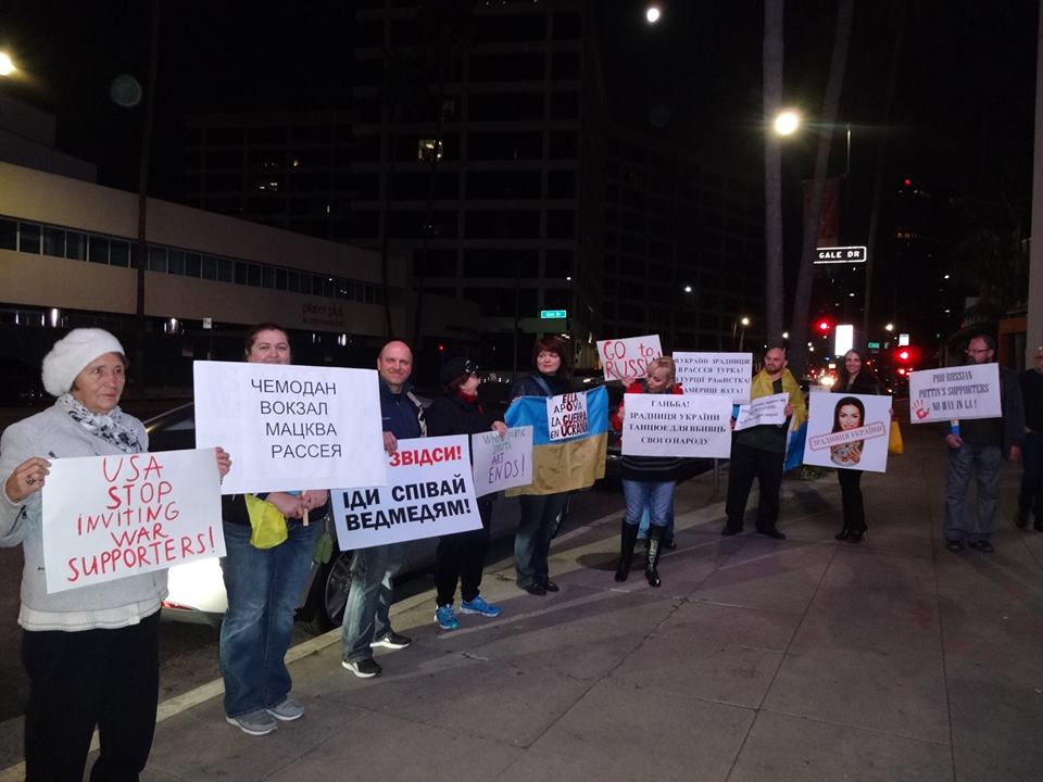 Похожую акцию протеста 23 января устроили и украинцы, проживающие в Лос-Анджелесе. Они также вышли на улицу с транспарантами и украинскими флагами, выкрикивая: «Слава нации», «Слава Украине», «Украина превыше всего». Фото и видео с митинга поделилась на своей странице в Facebook Vita Knudson.