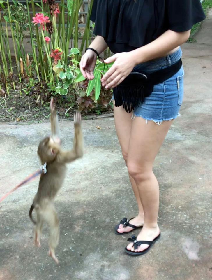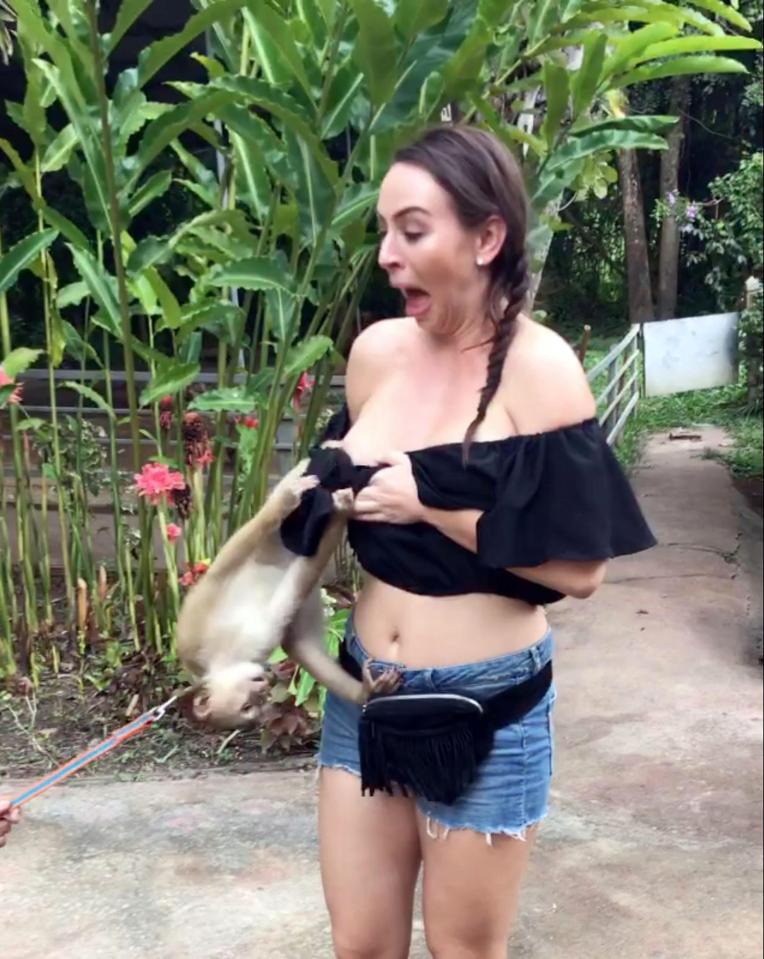 Сначала девушке это показалось забавным, но затем ловкая макака взобралась по шортам до топ красавицы и почти обнажила ее грудь, нагло потянув за резинку.