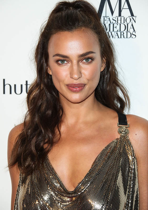 Супермодель Ирина Шейк появилась на церемонии Fashion Media Awards в Парк Хайят в Нью-Йорке в сексуальном золотом платье от Дома моды Versace. Пикантность наряду добавлял экстремальный разрез от бедра до пола, под которым трудно было рассмотреть наличие белья.