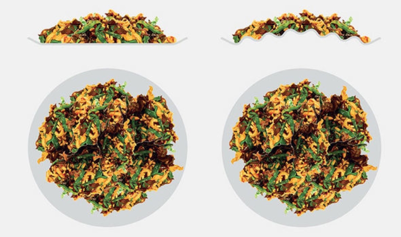 Латвийский художник Наурис Чинович создал тарелку с неровным дном, которая помогает похудеть. Сверху эта тарелка выглядит как любая другая. Однако в разрезе – она не плоская, а волнистая. За счёт этого создаётся иллюзия, словно на тарелке много еды. Таким образом, человек может обмануть своё зрение и желудок.