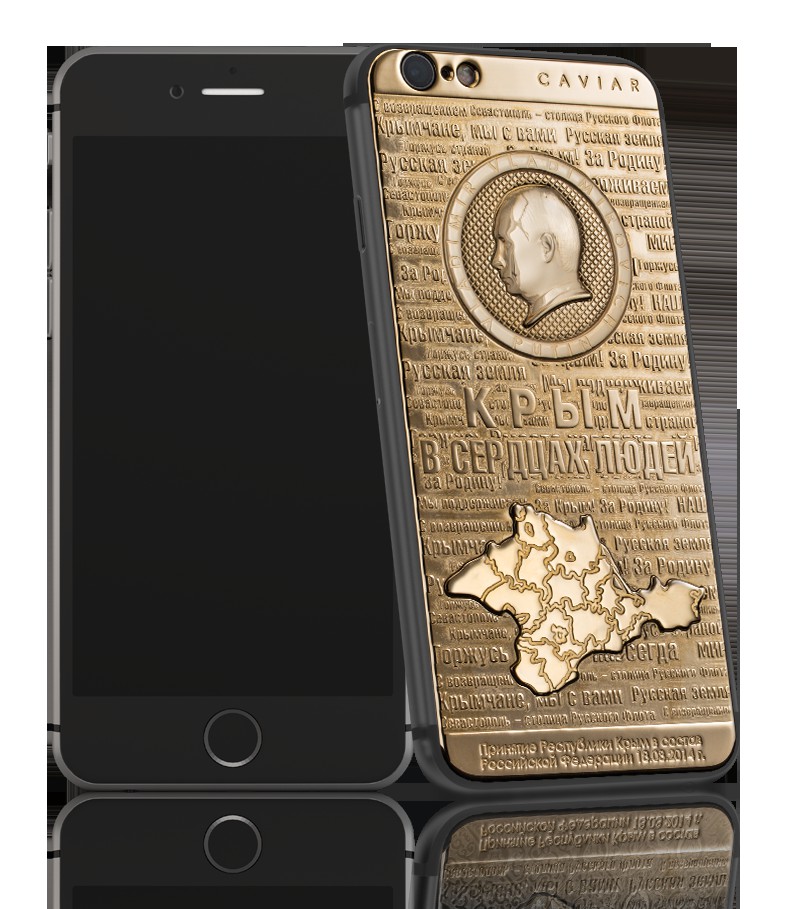 Лимитированная золотая модель также украшена цитатой президента РФ «Крым в сердцах людей». Эту фразу он произнес 18 марта 2014 года, когда провозгласил присоединение Крыма.