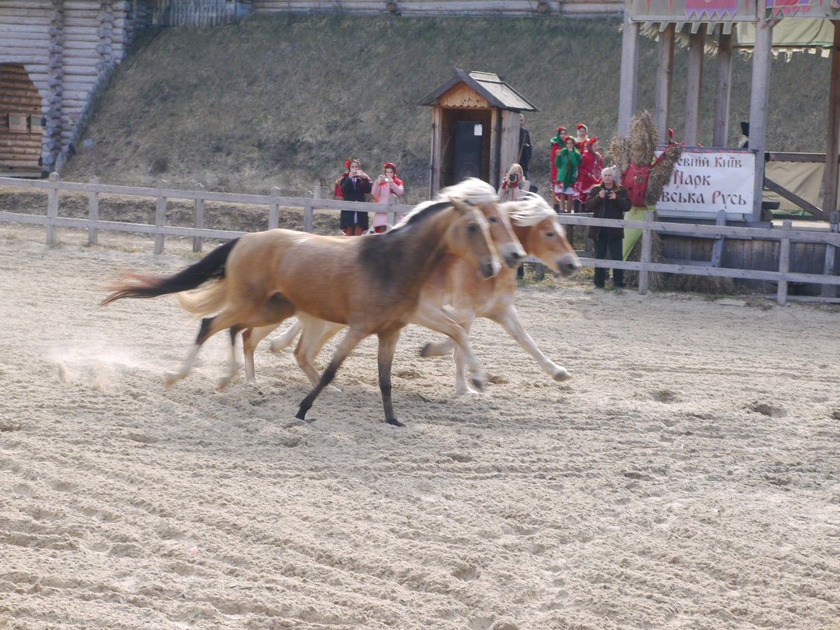 Началась программа около 14:00, когда народу собралось видимо-невидимо. Именно тогда с приветственным словом выступил князь Владимир Красно Солнышко – президент парка «Киевская Русь» Владимир Янченко, пожелавший всем мира и благополучия. После чего началась театрализованная программа. На главном ристалище были и выступления творческих коллективов Киевской области, и выступления конно-трюкового театра парка, и даже соревнования конных лучников. Кстати, в соревнованиях участвовали не только мужчины, но и представители самой прекрасной половины человечества, которые показали, что также умеют не только борщи варить, но и во время стрельбы из лука, при этом несясь галопом на лошадях, попадать в десятку.