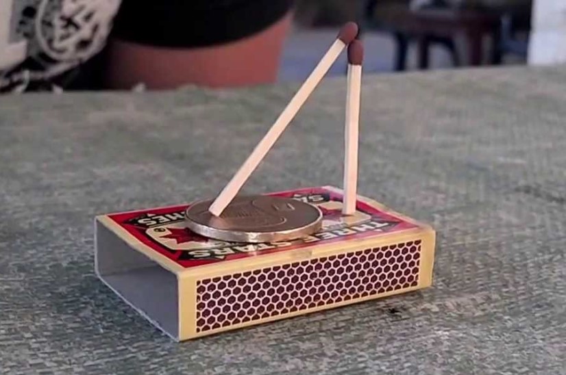 Для начала нужно закрепить одну спичку в коробке, затем положить на коробок монету, а сверху на нее поставить другую спичку, так, чтобы она упиралась одним концом в первую спичку.