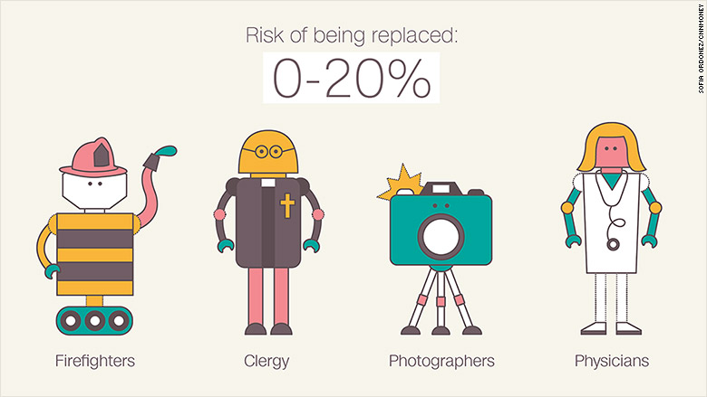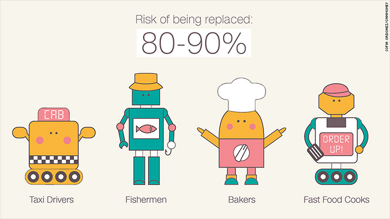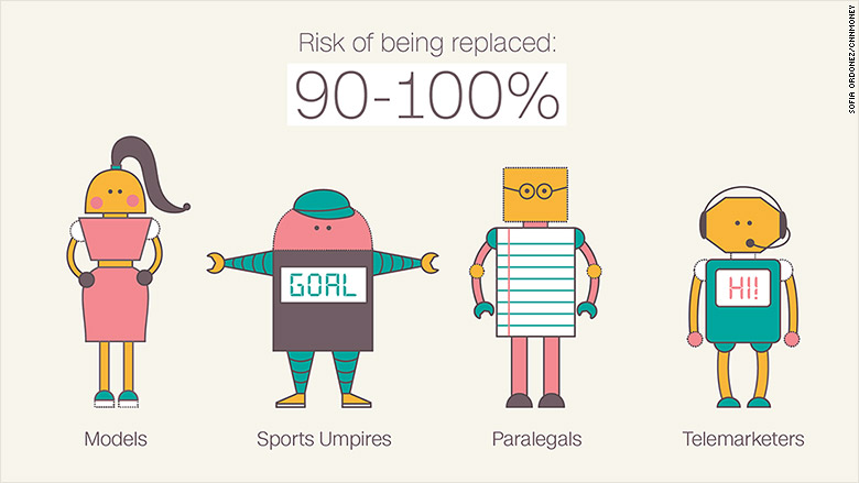 В зоне риска — административные должности, производственные профессии и специальности, связанные с обработкой данных. Высокий риск роботизации (80-100%) у следующих специальностей: экскурсоводы, таксисты, пекари, мясники, модели, фармацевты, страховые агенты, продавцы, сборщики налогов и чиновники.