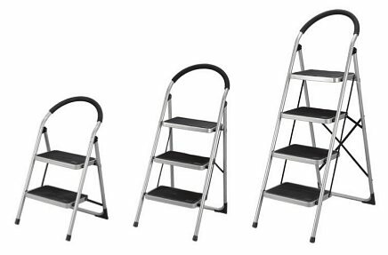 - Ступени. Судя по отзывам пользователей, вальцовки или вдавленные в металл ступеньки – наиболее безопасный вариант. Стоит обратить внимание на ширину – как правило, она равна ширине стоек, но для малярных и строительных работ выбирать стоит модель, где они шире стоек. Количество ступеней – от 2 до 30 – все зависит от высоты. Выбирать рекомендуется варианты с рифленой, подрезанной поверхностью: это препятствует скольжению и гарантирует безопасность.