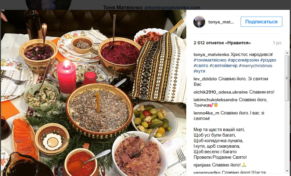 Украинские звезды в социальных сетях показали, как они отмечают Рождество. Многие предпочли встретить светлый праздник традиционно в семейном кругу, накрыв щедрый стол. Например, Тоня Матвиенко и Катя Осадчая похвастались фотографиями богатого стола с кутей и праздничными яствами.