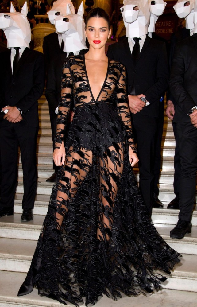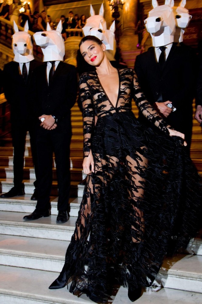 Супермодель Кендалл Дженнер появилась на праздновании 70-летия бренда Longchamp в Париже в пикантном прозрачном наряде с глубоким декольте, засветив голую грудь и нижнее белье. Она дополнила наряд сатиновыми полусапожками. Мероприятие состоялось с стенах знаменитой французской Оперы Гарнье.