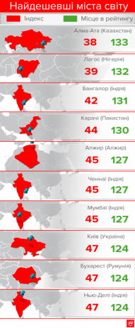 По соседству с Киевом — Алжир (Алжир), Бухарест (Румыния), Мумбаи (Индия), Нью-Дели, Ченнаи и Бангалор (Индия), Карачи (Пакистан) и Лагос (Нигерия).