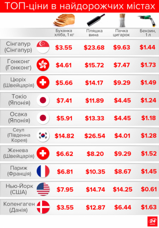 Исследователи Economist Intelligence Unit составили рейтинг самых дорогих городов мира. Учитывались цены на 160 видов товаров и услуг, в числе которых были хлеб, вино, коммунальные тарифы, сигареты, одежду, бензин и т. д. Первую строчку в списке занял Сингапур. Хлеб там стоит $3,55, вино — $23,68, пачка сигарет — $9,63, а за литр бензина придётся отдать $1,44.