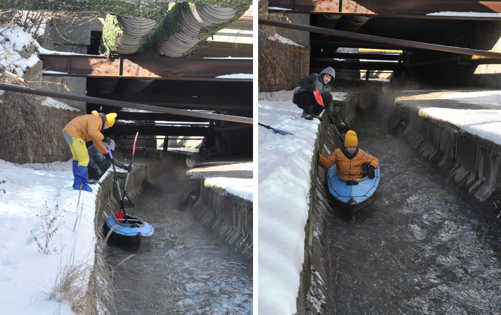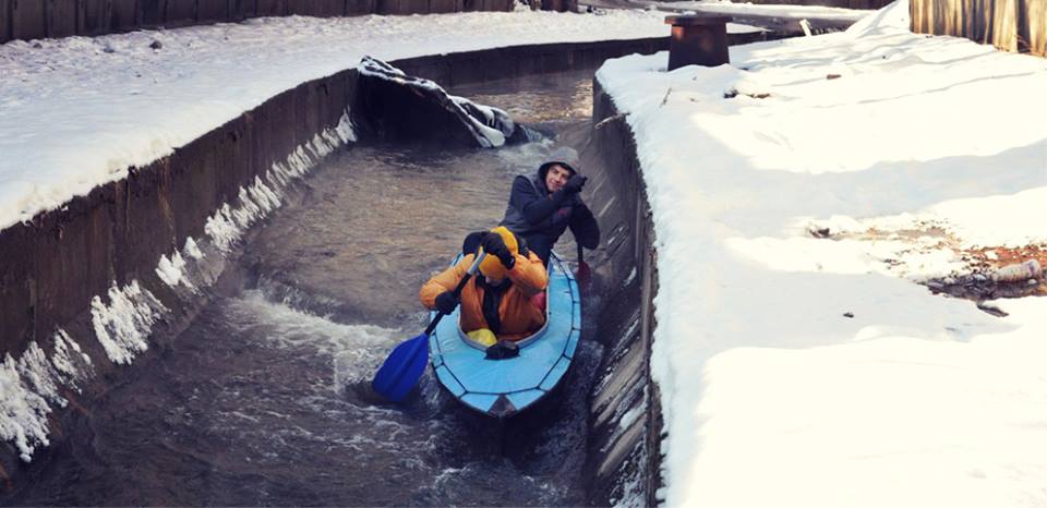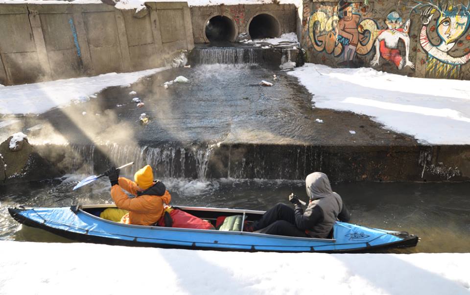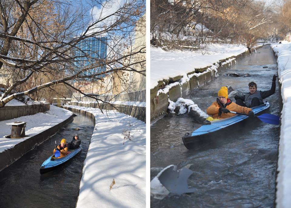 Двое киевлян, Максим Мрамонов и Дмитрий Нечволод, на днях решились на рисковое путешествие и сплавились по реке Лыбедь на каркасной байдарке. Длина маршрута составила 5 км. Старт — возле Ленинской кузни, затем мимо Ocean Plaza, а финиш — возле станции Киев-Московский. Экстремалы не смогли пройти весь запланированный маршрут до конца и оставшуюся часть собрались освоить уже весной.