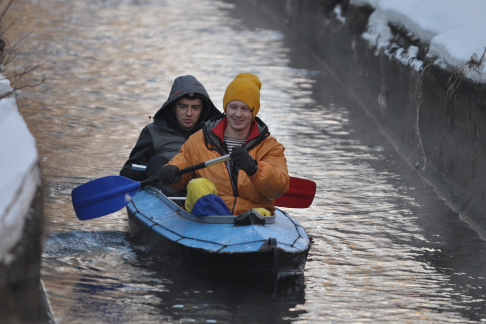 Двое киевлян, Максим Мрамонов и Дмитрий Нечволод, на днях решились на рисковое путешествие и сплавились по реке Лыбедь на каркасной байдарке. Длина маршрута составила 5 км. Старт — возле Ленинской кузни, затем мимо Ocean Plaza, а финиш — возле станции Киев-Московский. Экстремалы не смогли пройти весь запланированный маршрут до конца и оставшуюся часть собрались освоить уже весной.