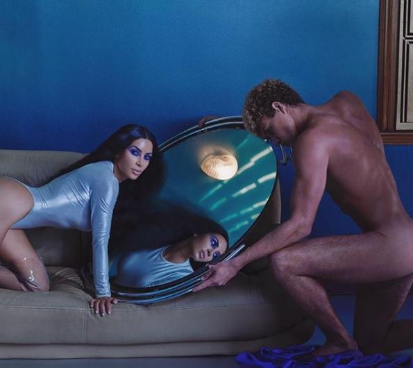 Ким Кардашьян показала откровенное ото, на котором она позирует в блестящем купальнике и лаковых ботфортах в откровенной позе. Партнером по фотосессии светской львицы стал голый мужчина атлетического телосложения.