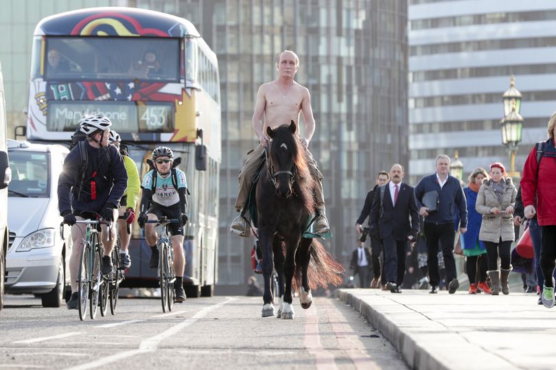 По мосту Ватерло в Лондоне проехался клоун, наряжённый под Путина. Комик инсценировал знаменитую фотографию 2009 года, когда президент России полуобнажившись проскакал на лошади в Сибири.