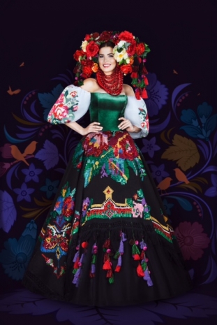 Дизайнерами наряда выступили Наталья Шевчук и Светлана Кубрак. Основной элемент костюма – юбка, которая вышита из старого ковра. Он был куплен у одного из коллекционеров и расшит крупными яркими цветами. Также юбка украшена множеством балабонов, пайеток и кистей.