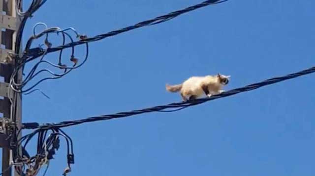 В Алжире кот взобрался на телефонные линии передач и решил совершить по ним прогулку. Помешали ему в этом подоспевшие спасатели.