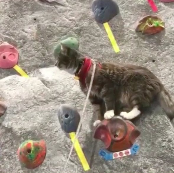 Кот Денали быстро стал местной знаменитостью, после того как пошел в зал на треновочную скалу. Иногда котенок лазил сам, но часто его поднимали дети в рюкзаке на спине.