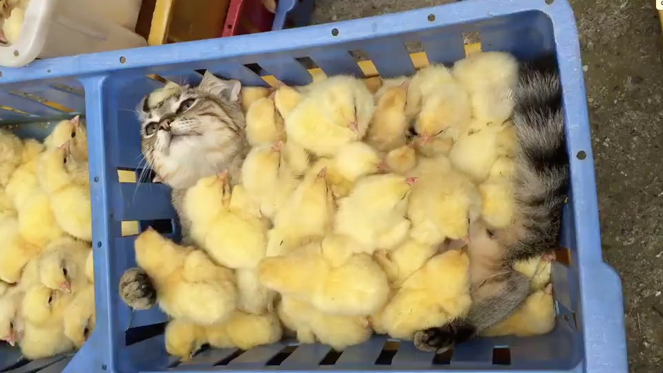 Кот зарылся в кучу цыплят womi 9 лет назад Ситуация: кот лежит в ящике, а на нем — два десятка цыплят. И ему хорошо. Идеальное времяпрепровождение.