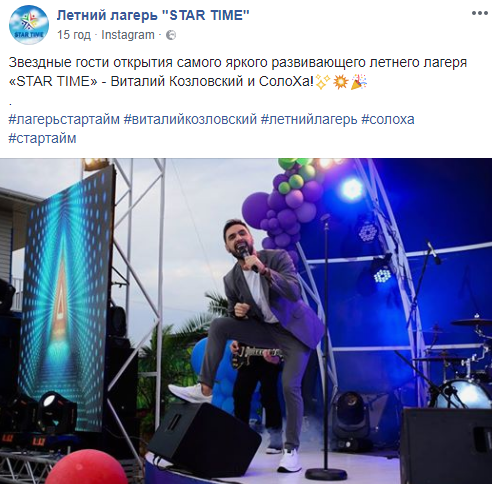 «Звездные гости открытия самого яркого развивающего летнего лагеря «STAR TIME» — Виталий Козловский и СолоХа!» — сказано в сообщении.
