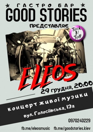 В последние дни уходящего года Квартет Eleos приглашает в Good Stories! Начиная с 20:00 29 декабря все посетители смогут насладиться исполнением лучших хитов, когда-либо написанных в стилях рок-н-ролл и блюз-рок.