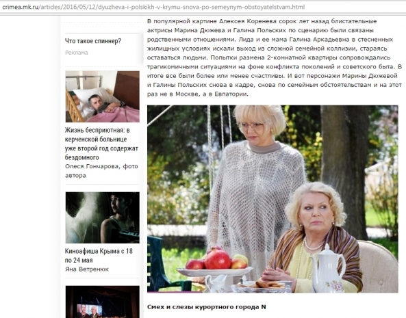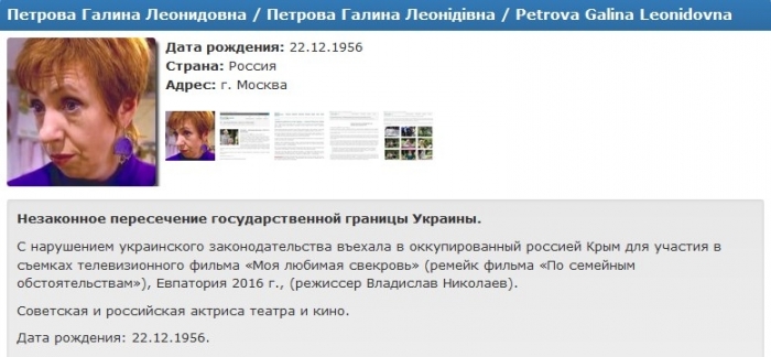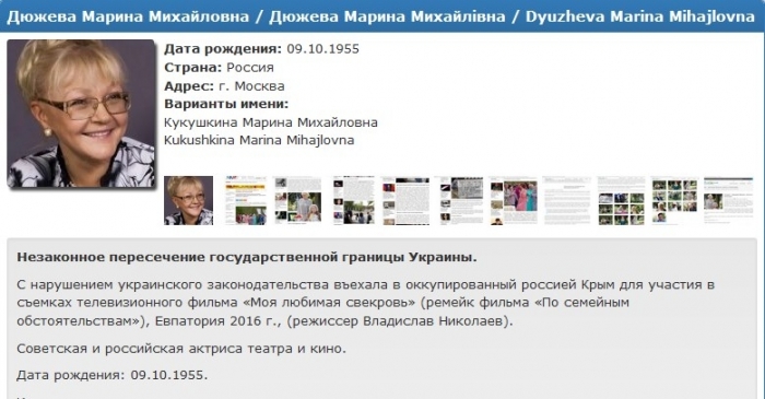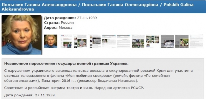 Центр исследования преступлений против нацбезопасности Украины «Миротворец» внёс в список «Чистилище» трёх известных российских актрис Галину Польских, Марину Дюжеву и Галину Петрову. Им предъявляется незаконное пересечение украинской границы во время посещение Крыма. Артистки въехали на полуостров для съёмок фильма «Моя любимая свекровь», который будет ремейком картины «По семейным обстоятельствам».