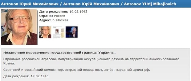 В базу преступников украинского центра «Миротворец» попал знаменитый советский и российский музыкант и композитор Юрий Антонов. Ему предъявляют незаконное пересечение украинской границы, отрицание российской агрессии в Украине, а также популяризацию оккупационного режима на территории аннексированного Крыма.
