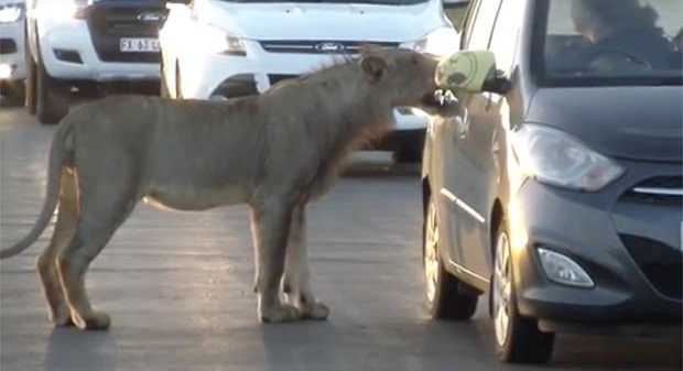 В ролике молодой лев подходит к машине с двумя женщинами и начинает активно ее обнюхивать. Затем он пару раз зубами попытался открыть заднюю дверь, но испуганные пассажиры заблокировали ее.