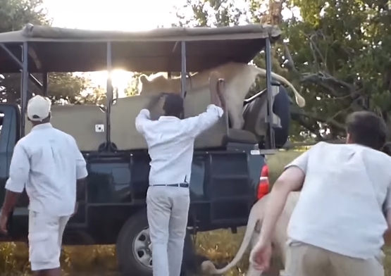 Во время сафари лев заскочил в туристический джип и посеял панику среди пассажиров. Видео было сделано в национальном парке Крюгера в Южно-Африканской Республике. Об этом сообщает Daily Mail.