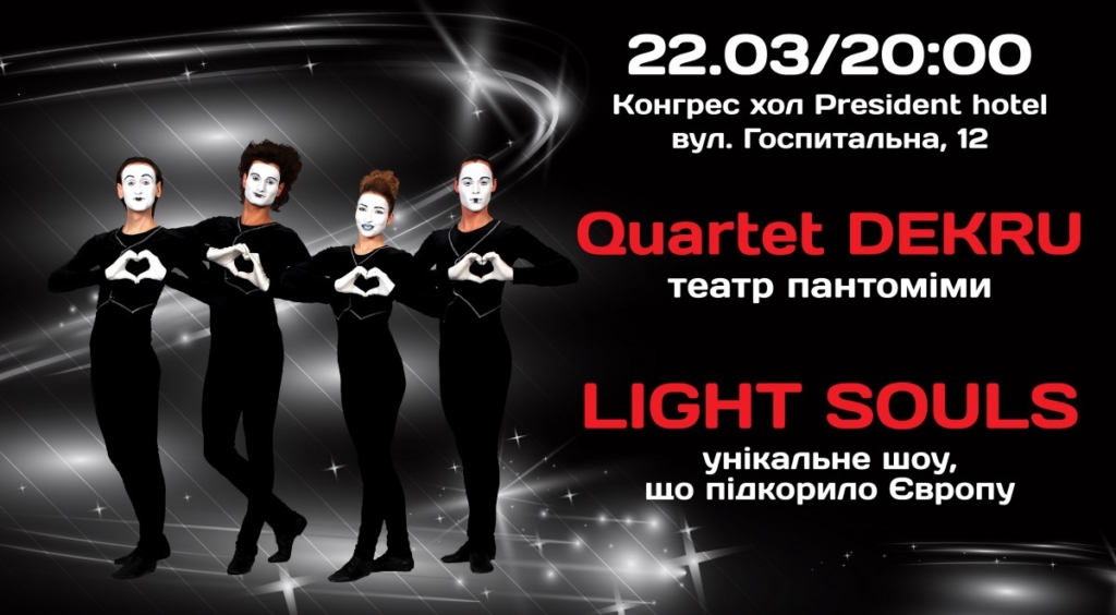 22 марта в Киеве в Конгрес хол (President hotel) будет показано шоу Light Souls (Светлые души), которое завоевало любовь и сердца европейских зрителей! В Light souls собрана вся палитра человеческих чувств, где сплелись самые чистые и искренние человеческие эмоции. Современный, стильный и актуальный взгляд на сегодняшнюю жизнь.