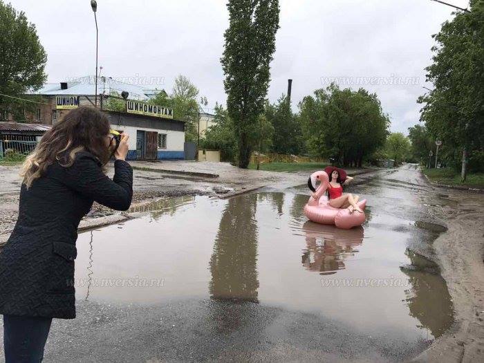 Пользователи высмеяли фотосессию в луже, где с надувным фламинго позировала российская модель. Снимки были сделаны в Саратове. Таким образом авторы снимков хотели обратить внимание местных властей к проблеме неотремонтированных дорог.