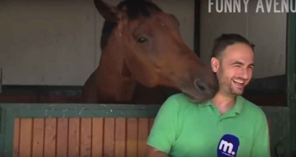 Журналист греческого информационно-развлекательного канала «Македония ТВ» попытался рассказать на камеру о выездке, стоя на фоне одной из лошадей. Но каждый раз, когда репортер начинал с серьезным выражением лица читать текст, конь по имени Фрэнки вмешивался в репортаж и пытался потереться мордой о журналиста или облизать его.