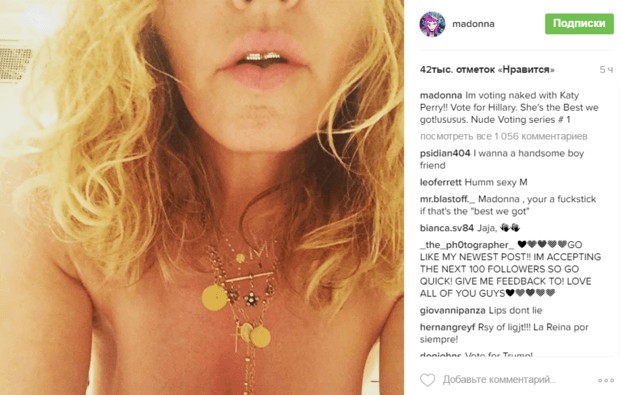 Вслед за американской певицей Кетти Перри, которая оголилась ради призыва пойти на выборы, Мадонна также решила поддержать своего любимого кандидата в предвыборной гонке. Поп-королева отдала свой голос за Хиллари Клинтон.