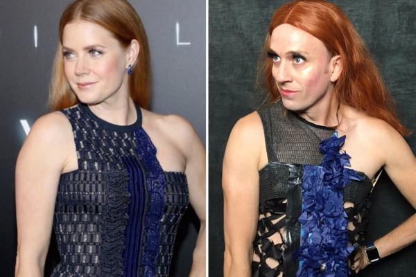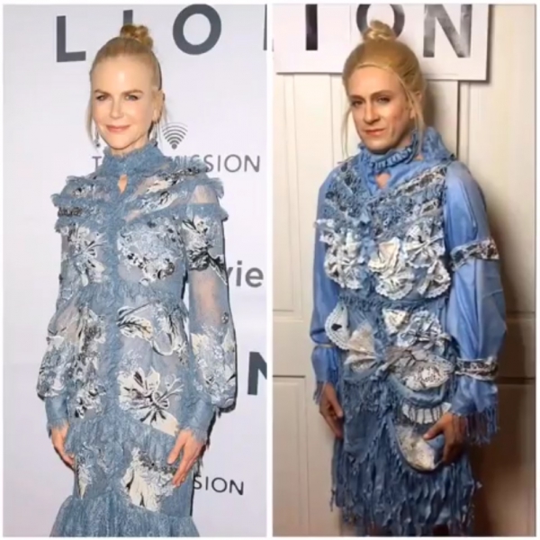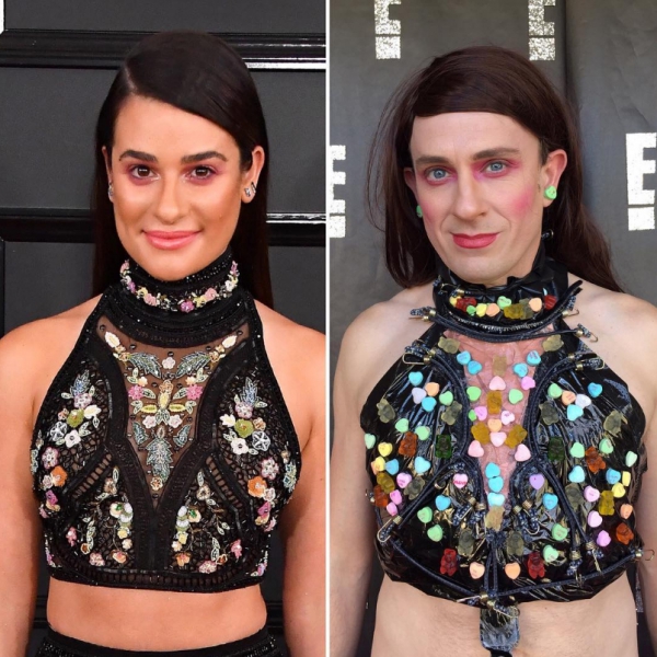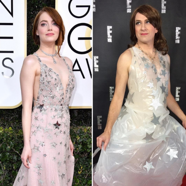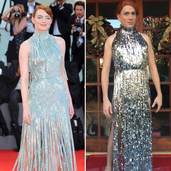 Американский актёр Том Ленк создаёт цикл пародий на наряды знаменитостей. Эти фото он выкладывает в Instagram, где они пользуются широкой популярностью. У него уже 170 тыс. подписчиков.
